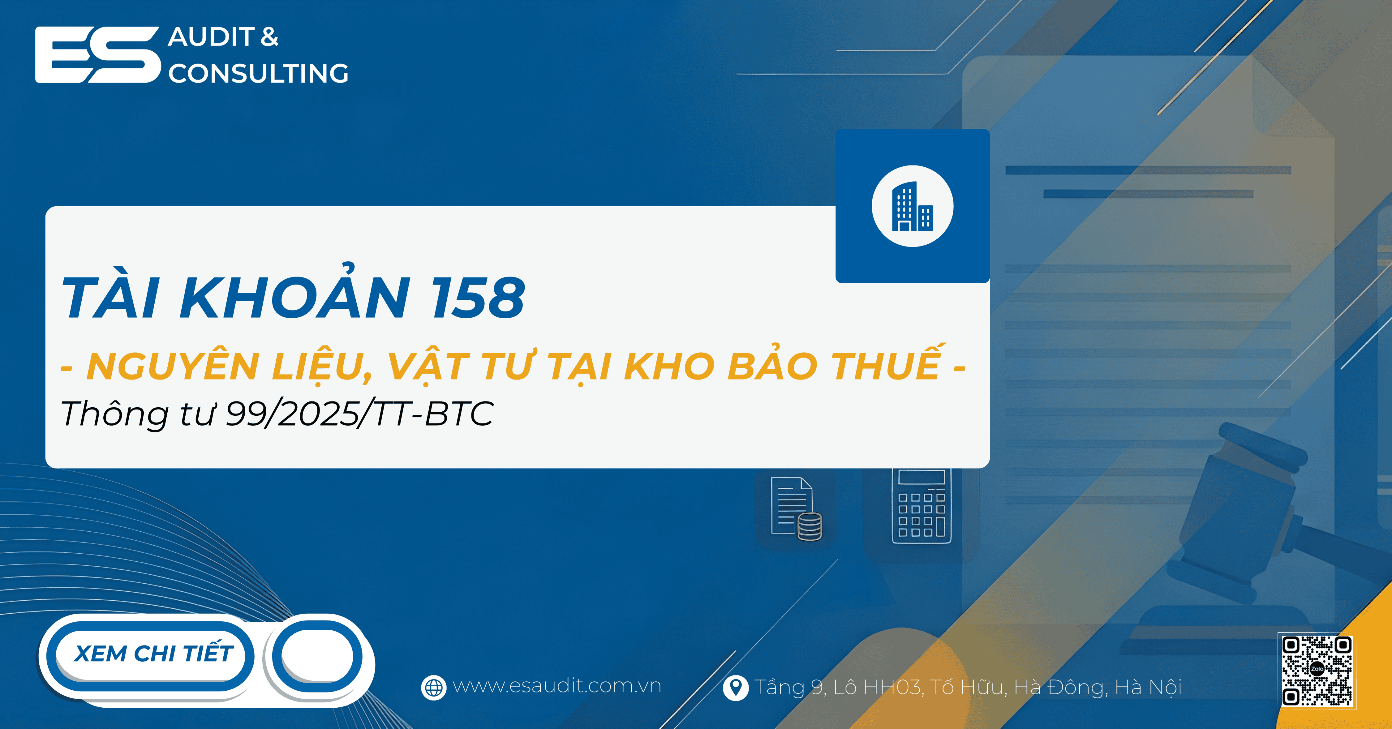Trên đây, Hãng Kiểm toán ES vừa chia sẻ bài viết Tài khoản 158 - Hàng hóa kho bảo thuế theo Thông tư 99/2025/TT-BTC. Nếu có vấn đề chưa rõ hoặc cần hỗ trợ, bạn đọc có thể để lại bình luận bên dưới hoặc đặt câu hỏi theo đường dẫn dưới đây để được hỗ trợ trong thời gian sớm nhất: https://esaudit.com.vn/hoi-dap/.Cảm ơn các bạn đã theo dõi bài viết Tài khoản 158 theo Thông tư 99, chúc các bạn thành công!