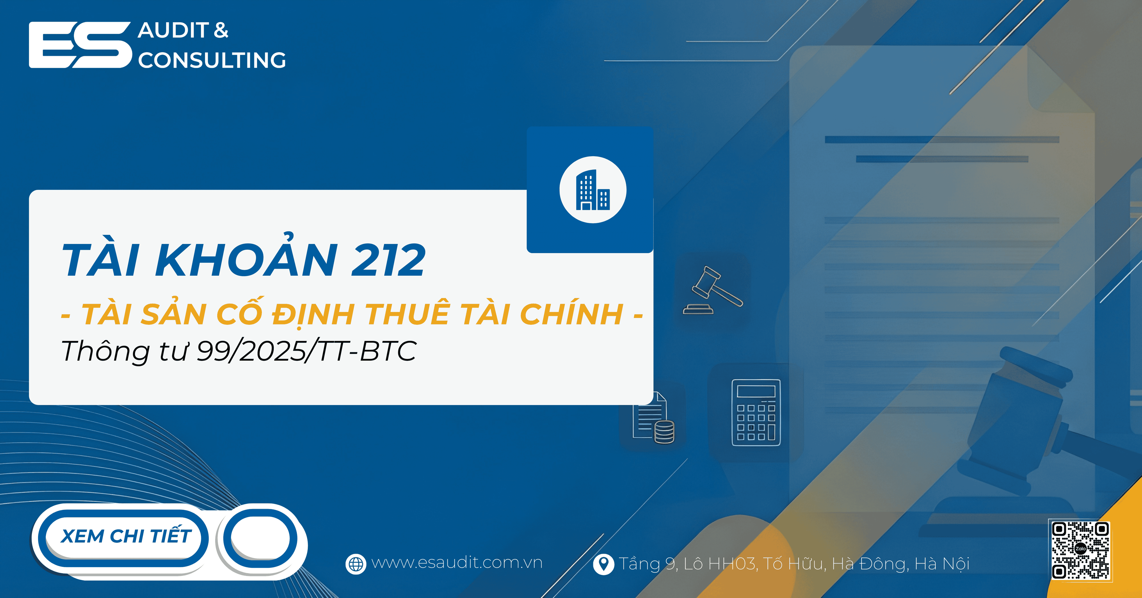 Trên đây, Hãng Kiểm toán ES vừa chia sẻ bài viết Tài khoản 212 - Tài sản cố định thuê tài chính theo Thông tư 99/2025/TT-BTC. Nếu có vấn đề chưa rõ hoặc cần hỗ trợ, bạn đọc có thể để lại bình luận bên dưới hoặc đặt câu hỏi theo đường dẫn dưới đây để được hỗ trợ trong thời gian sớm nhất: https://esaudit.com.vn/hoi-dap/.Cảm ơn các bạn đã theo dõi bài viết Tài khoản 212 theo Thông tư 99, chúc các bạn thành công!